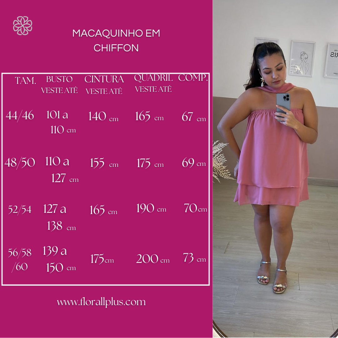 Detalhes do produto: - Macaquinho em chiffon com forro em shorts; - Modelagem ampla, conforto garantido; - Faixa versátil para cintura ou pescoço; - Tamanhos disponíveis: 44 a 62; - Cor: rosa queimado.
