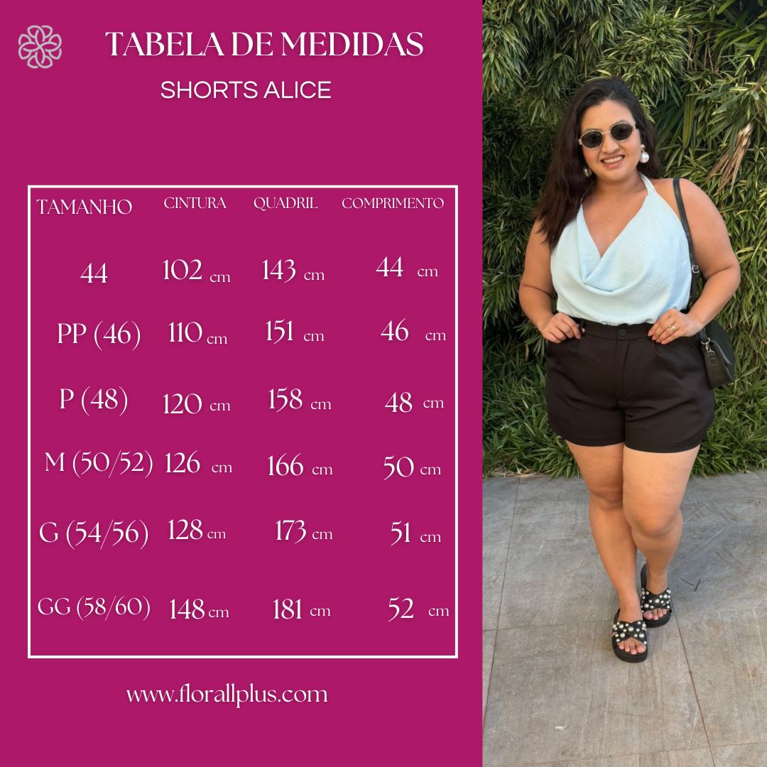 Disponível nos tamanhos do 44 ao 60 (44, PP 46, P 48, M 50/52, G 54/56 e GG 58/60), o Shorts Alice é versátil e se adapta a diferentes corpos com elegância. Eleve seu guarda-roupa com essa peça clássica e que nunca sai de moda!