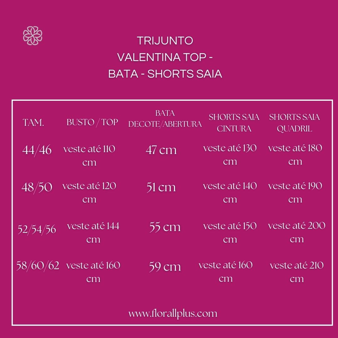 Confeccionado em tecido leve, ideal para o verão, o Trijunto VALENTINA oferece conforto sem abrir mão do estilo sofisticado. Disponível nos tamanhos 44/46, 48/50, 52/54/56 e 58/60/62, atende perfeitamente às curvas plus size, valorizando sua silhueta com charme e delicadeza.