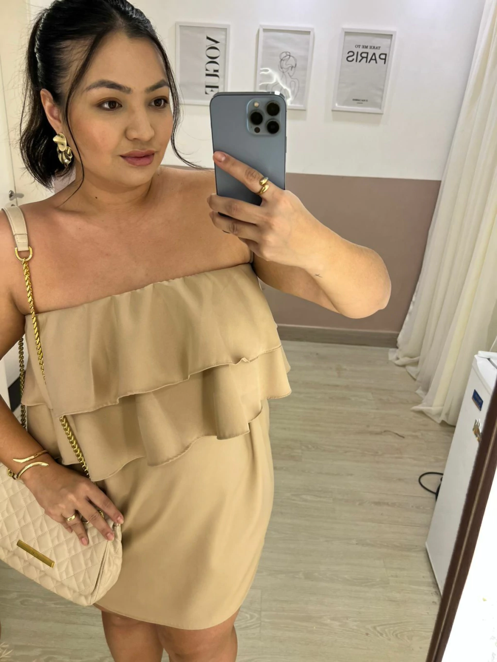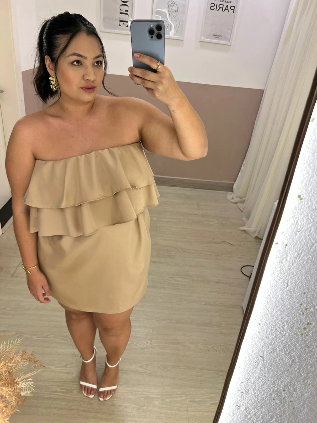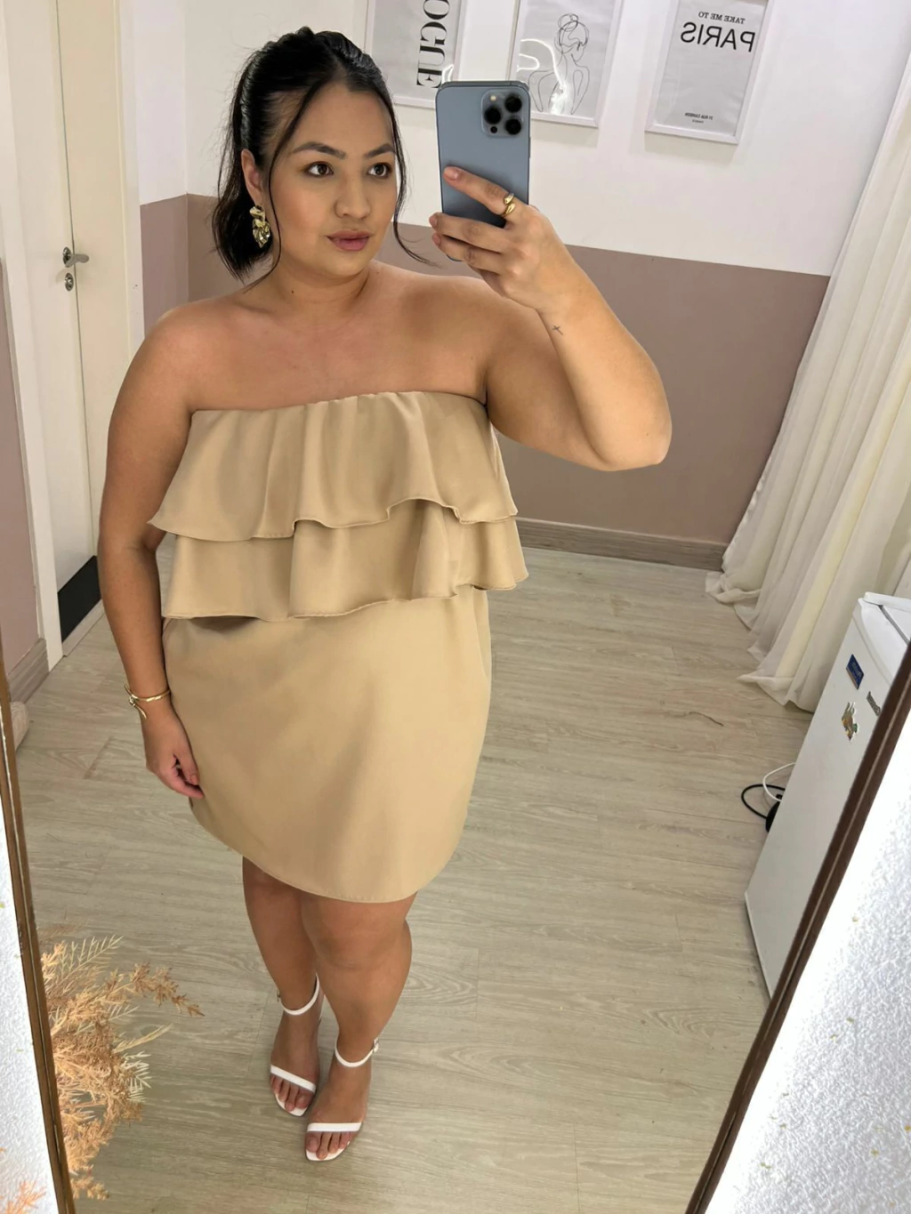 Com um corte reto que valoriza a silhueta, esse vestido tomara que caia em alfaiataria traz um charme especial com dois babados delicados no busto, tanto na frente quanto nas costas. O elástico na cintura garante uma marcação sutil, realçando suas curvas com conforto.