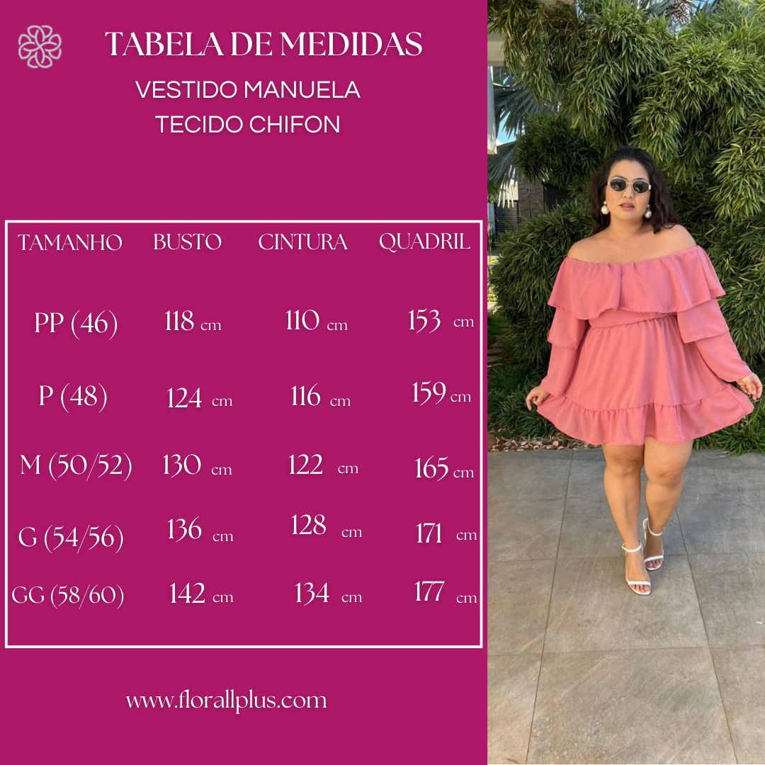 Disponível em numerações que vão do 44 ao 60, o Vestido Manuela atende a diferentes corpos, do PP ao GG, com tamanhos detalhados para que você encontre o caimento ideal.