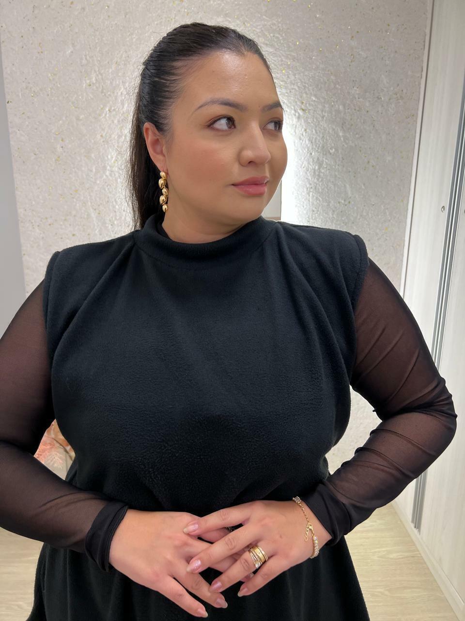 Este vestido em plush é a escolha perfeita para os dias frios, combinando conforto e sofisticação. Com modelagem reta e comprimento na altura do joelho, ele valoriza a silhueta de forma sutil e moderna. A gola sem mangas proporciona versatilidade, permitindo o uso com uma blusa de tule por baixo para um toque fashion único.